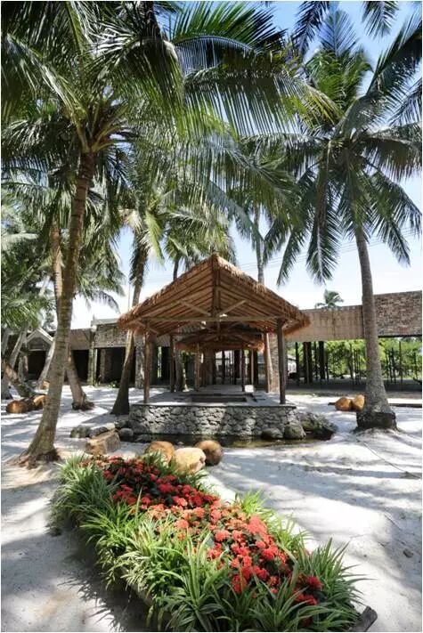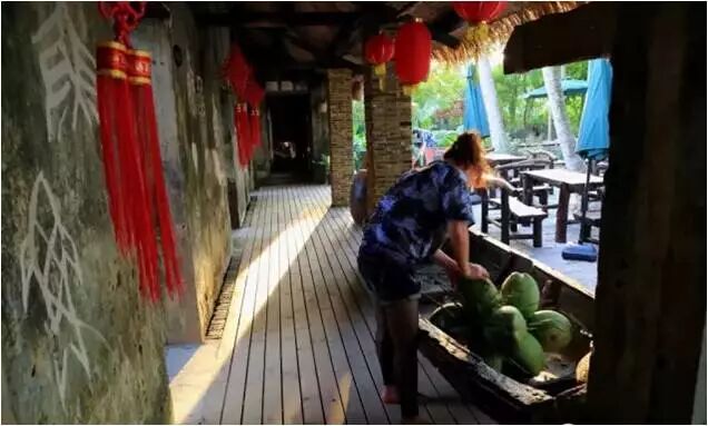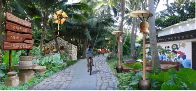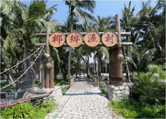 海南侨乡文昌东郊镇码头村委会下东村是九源国际海南分公司美丽乡村建设改造的重点项目之一,改造后项目更名为椰岛渔村。村前改造后的生态椰吧,是由5间老房子组成,在细节上处处显示着独特的理念。一只传统小木船,静静地靠泊在生态椰吧中央,处处营造着乡土、古朴的传统古渔村氛围。褐色的大小瓷坛在设计师的巧手下,时而成了镶嵌在墙体上的花瓶,时而又成为颇具渔民风情的灯墩。一排排缠绕着麻绳的路灯在椰间小路里蜿蜒。