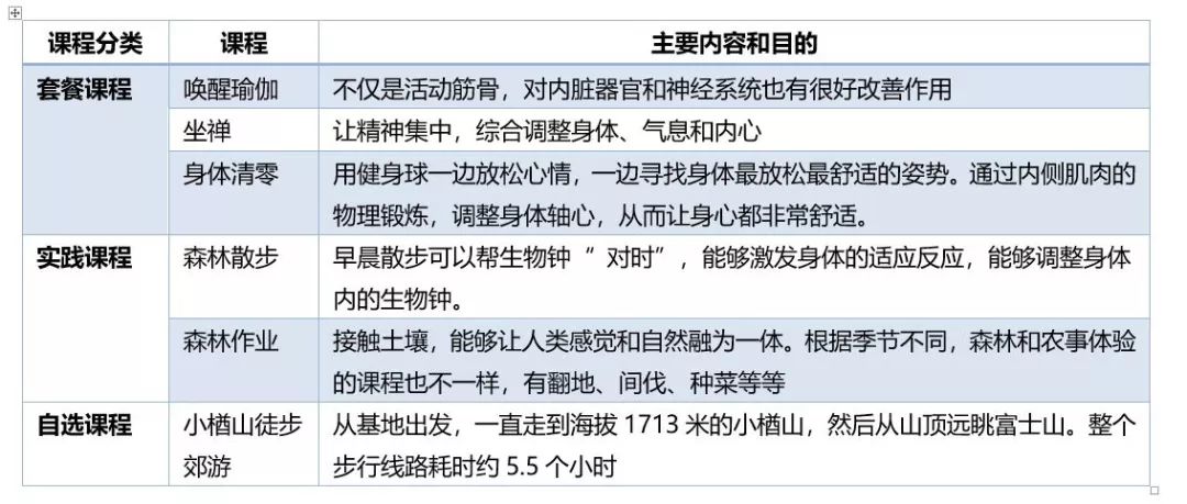 基地结合森林和农园资源,以轻运动为主体,以专业的指导和有计划的课程安排实现身心放松。设置多元课程,满足不同人的需求。