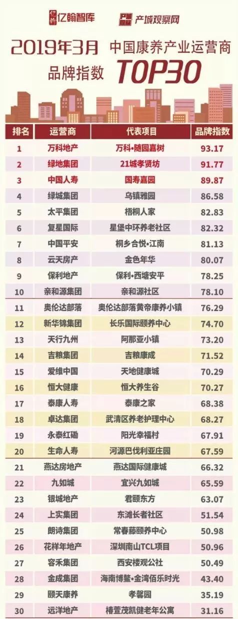 而就在近日,产城观察网联合亿翰智库针对行业内主流康养产业运营商及项目进行系统性监测,针对媒体、行业和项目三大维度指标得出康养行业品牌指数,反映当前中国康养产业品牌影响力现状。